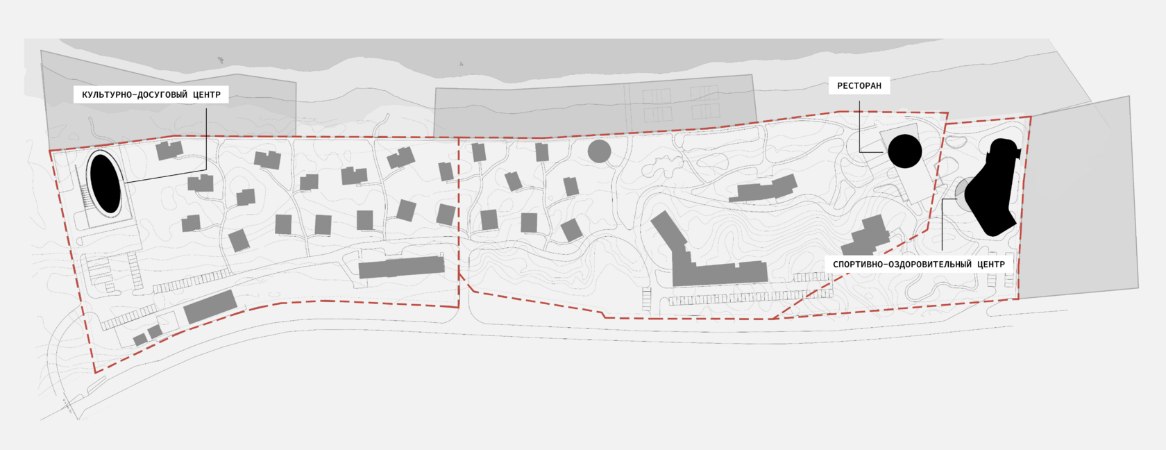 Комплекс расположен на территории соснового леса с минимальным вмешательством в природный ландшафт. Основные помещения обладают видовыми характеристиками в сторону соснового леса и Финского залива. Комплекс включает три функциональных объекта: культурно-досуговый центр, ресторан и спортивно-оздоровительный центр.