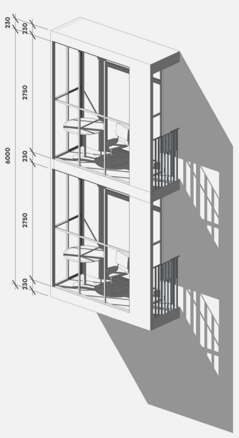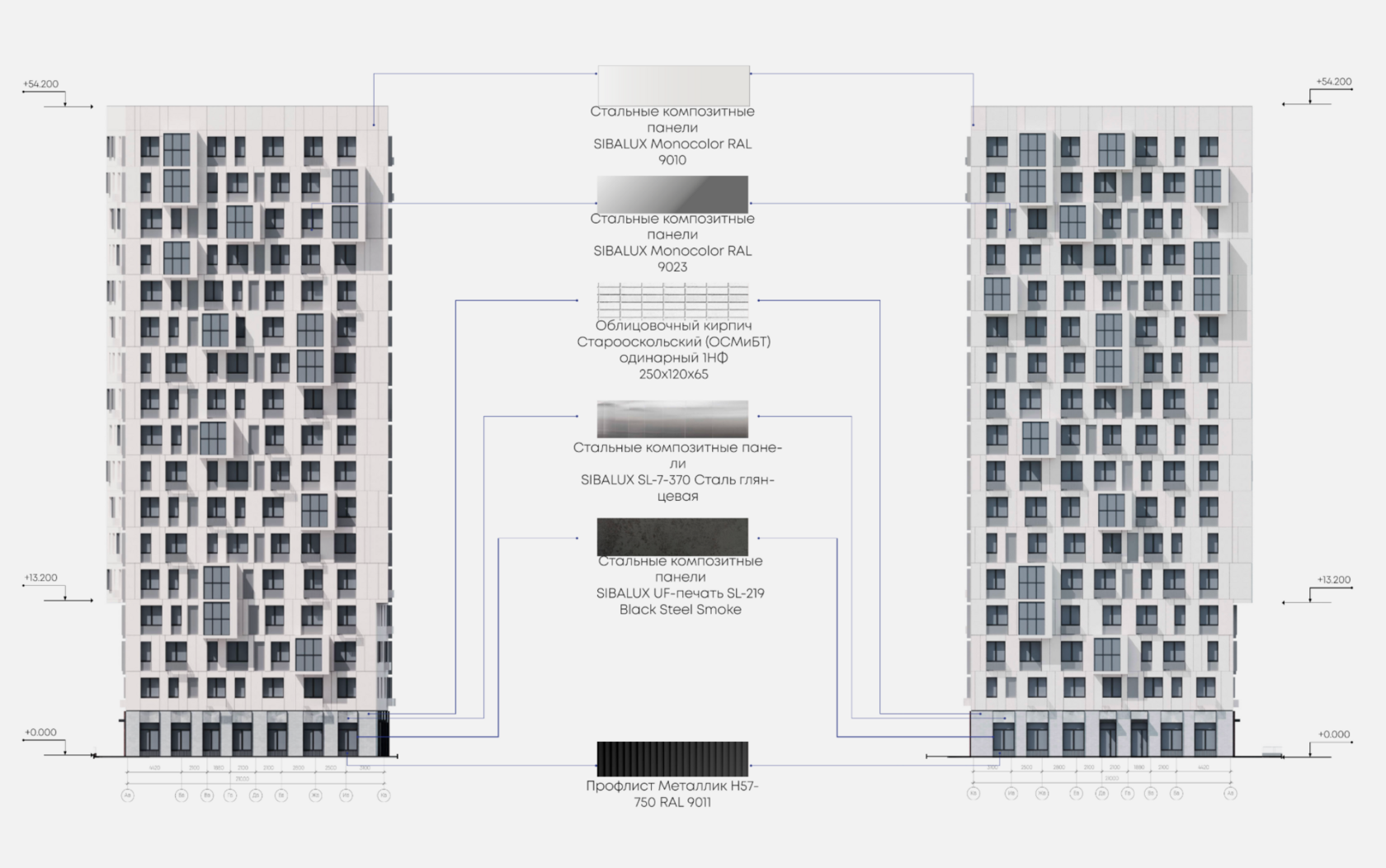В отделке фасадов применяются стальные композитные панели SIBALUX, профлист металлик RAL 9006/9011, а также облицовочный кирпич различных фактур. Система панелей построена по принципу модульной логики, обеспечивая визуальную ритмичность и долговечность фасада.